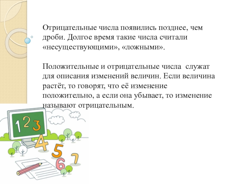 Отрицательные числа появились позднее, чем дроби. Долгое время такие числа считали «несуществующими», «ложными».Положительные и отрицательные числа служат