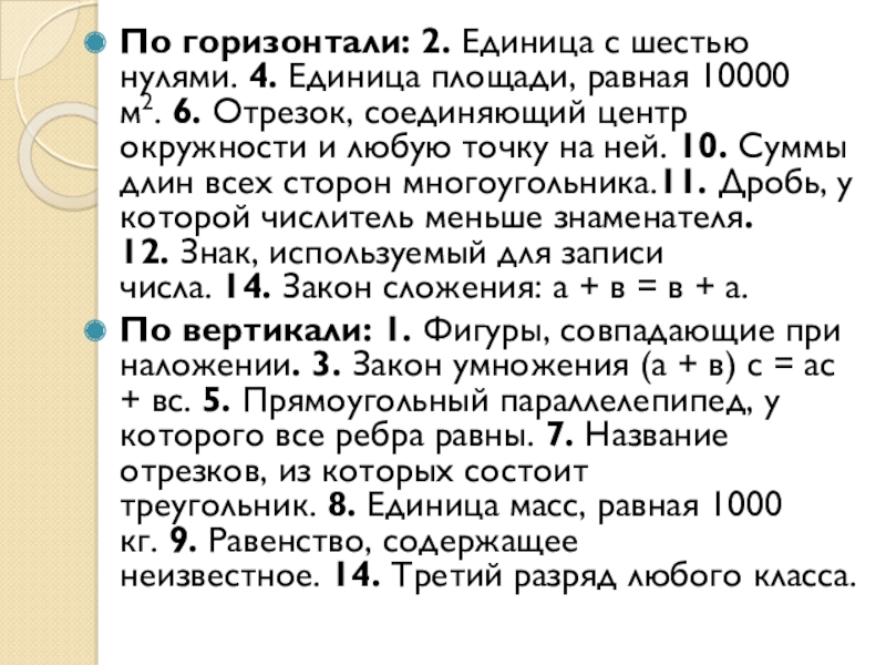 центр окружности и любую точку на ней. 10. Суммы длин всех сторон многоугольника.11. Дробь, у которой числитель меньше знаменателя. 12. Знак, используемый для записи числа. 14. Закон сложения: а + в = в + а.