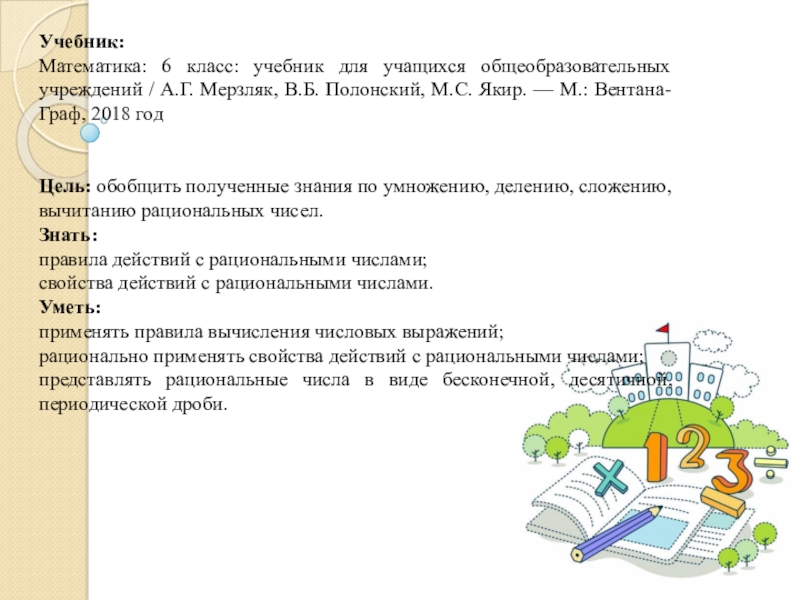 Учебник:Математика: 6 класс: учебник для учащихся общеобразовательных учреждений / А.Г. Мерзляк, В.Б. Полонский, М.С. Якир. — М.: Вентана-Граф, 2018 годЦель: обобщить полученные знания по умножению, делению, сложению, вычитанию рациональных чисел.Знать:правила действий с рациональными числами;свойства действий с рациональными