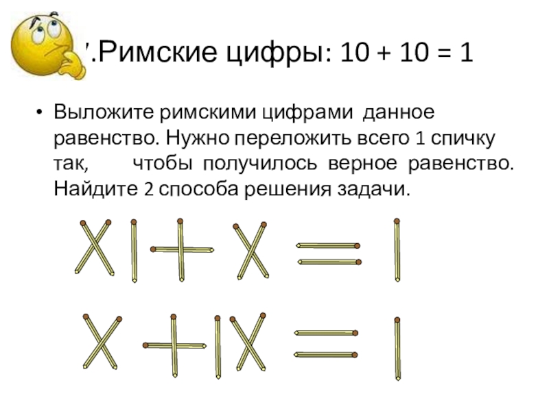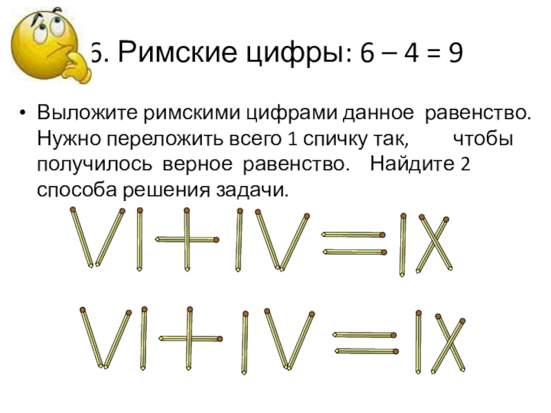 Выложите из спичек это равенство. Нужно переложить всего 1 спичку так, чтобы получилось верное равенство.