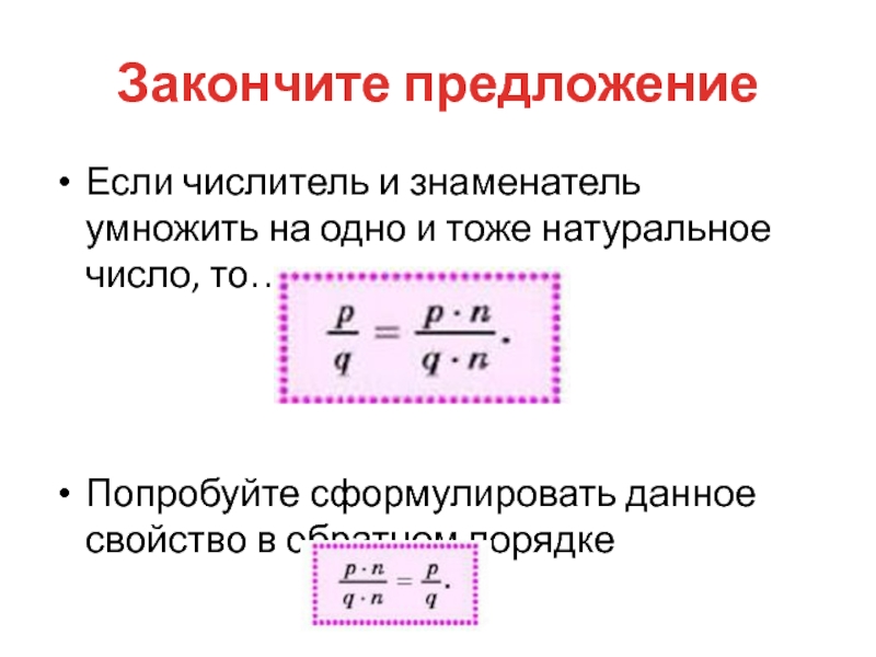 Закончите предложение Если числитель и знаменатель умножить на одно и тоже натуральное число, то…Попробуйте сформулировать данное свойство