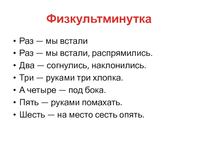 ФизкультминуткаРаз — мы всталиРаз — мы встали, распрямились.Два — согнулись, наклонились.Три — руками три хлопка.А четыре —