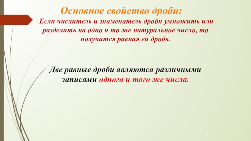 Если числитель и знаменатель дроби умножить или разделить на одно и то же натуральное число, то получится равная ей дробь.