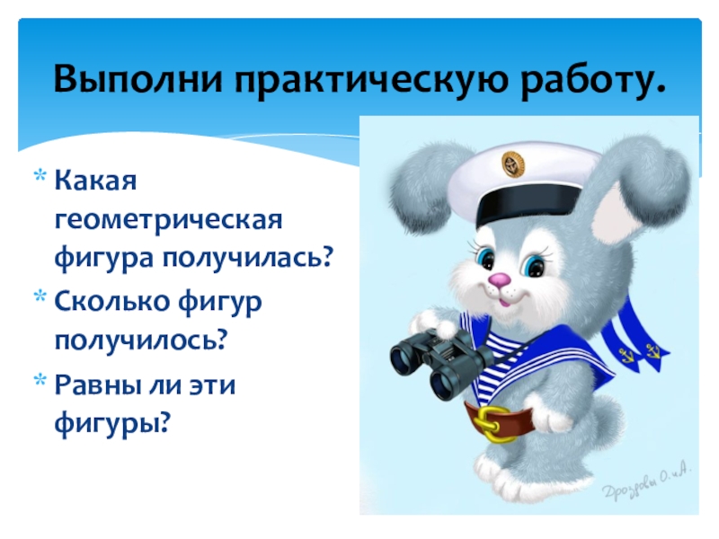 Какая геометрическая фигура получилась?Сколько фигур получилось?Равны ли эти фигуры?Выполни практическую работу.