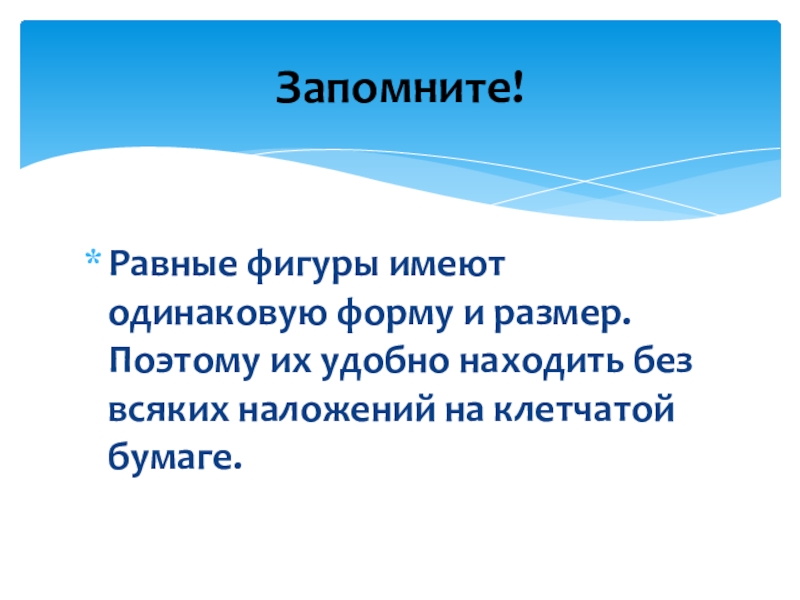 Равные фигуры имеют одинаковую форму и размер. Поэтому их удобно находить без всяких наложений на клетчатой бумаге.Запомните!