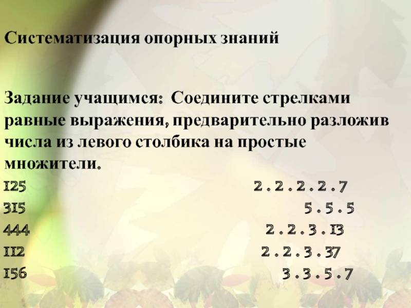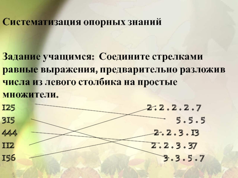 Задание учащимся: Соедините стрелками равные выражения, предварительно разложив числа