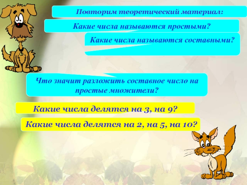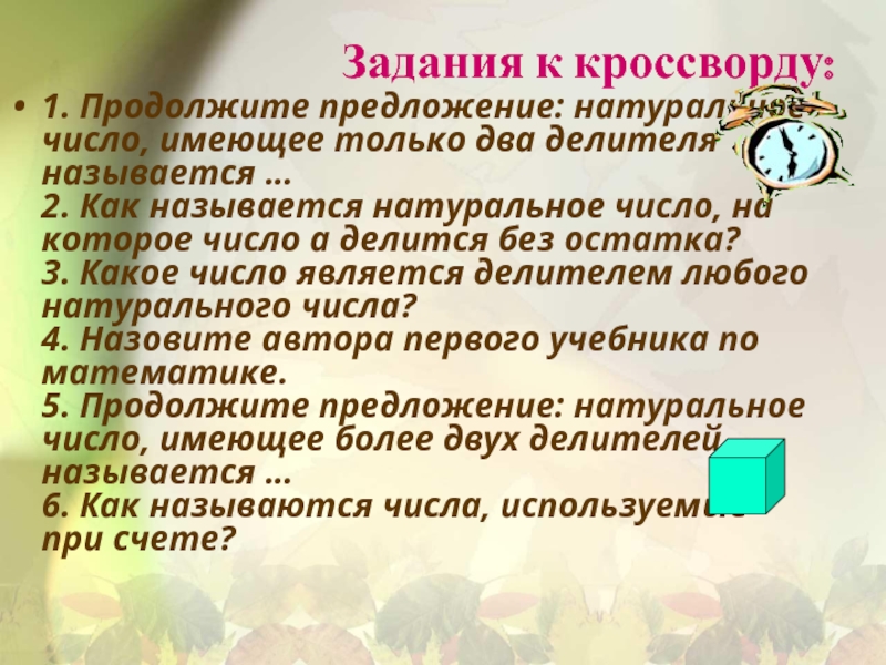 5. Продолжите предложение: натуральное число, имеющее более двух делителей, называется …