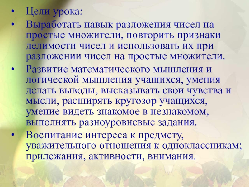 Выработать навык разложения чисел на простые множители, повторить признаки делимости