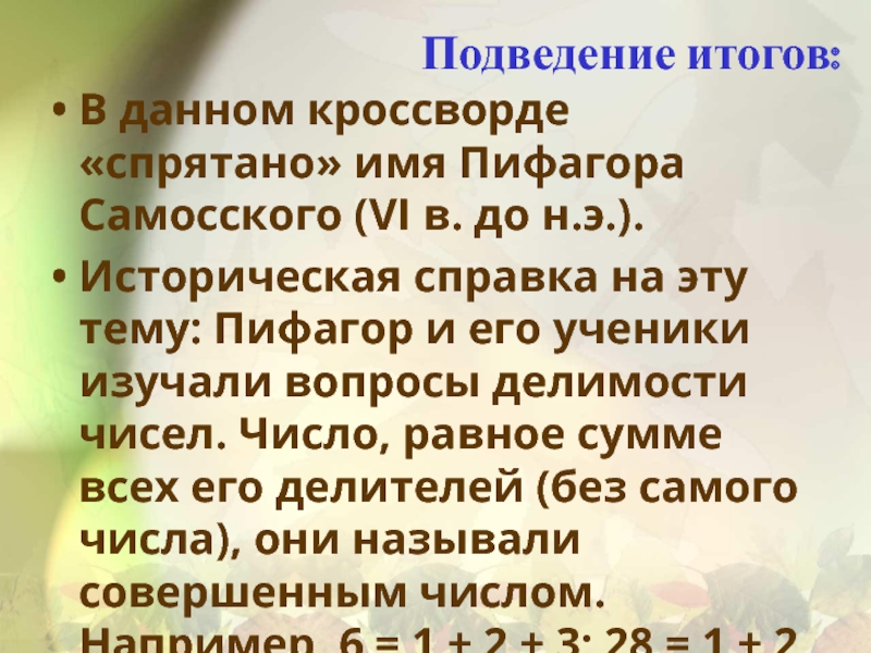 Историческая справка на эту тему: Пифагор и его ученики изучали вопросы делимости чисел. Число, равное сумме всех его делителей (без самого числа), они называли совершенным числом. Например, 6 = 1 + 2 + 3; 28 = 1 + 2 + 4 + 7 + 14;