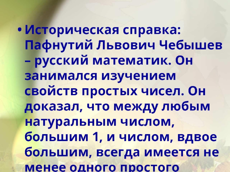 свойств простых чисел. Он доказал, что между любым натуральным числом, большим 1, и числом, вдвое большим, всегда имеется не менее одного простого числа.