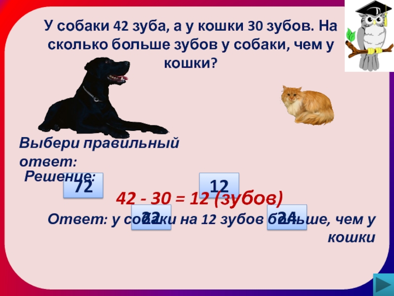 Ответ: у собаки на 12 зубов больше, чем у кошки