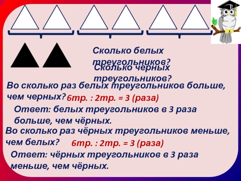 Ответ: чёрных треугольников в 3 раза меньше, чем чёрных.
