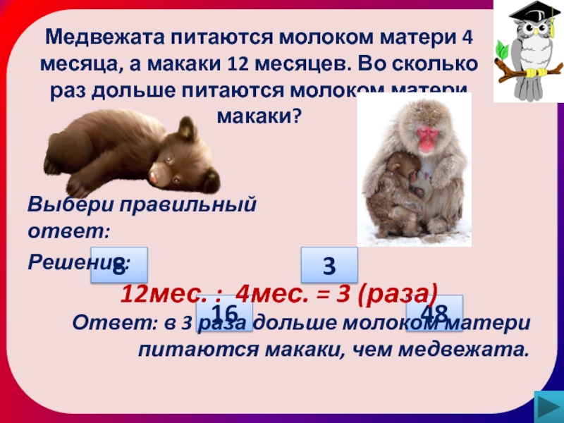 Ответ: в 3 раза дольше молоком матери питаются макаки, чем медвежата.