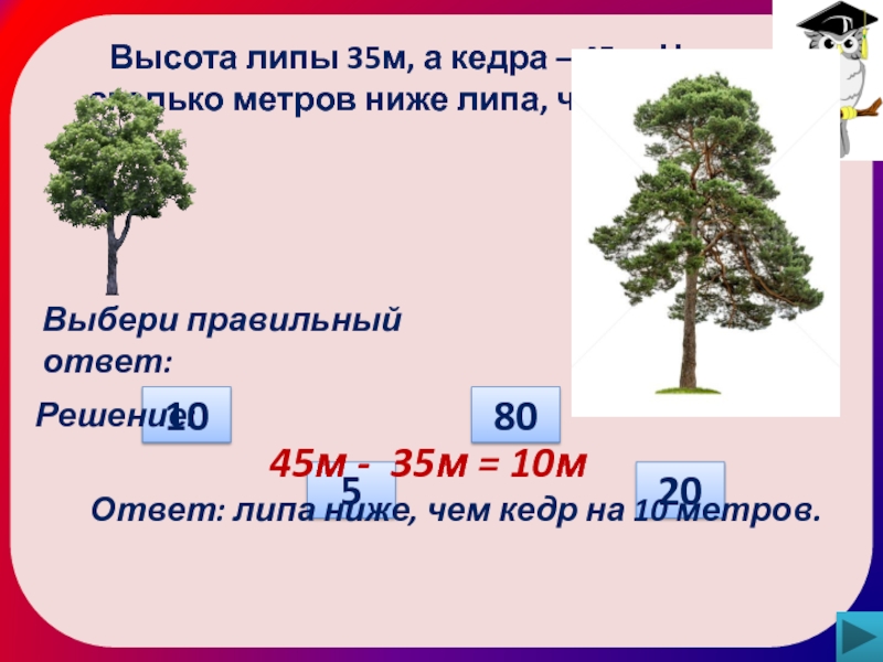 Ответ: липа ниже, чем кедр на 10 метров.