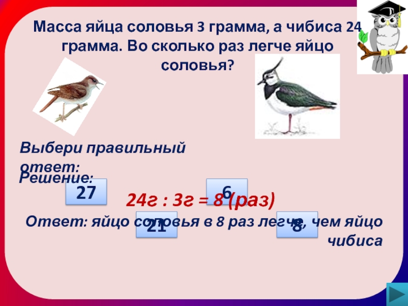 Ответ: яйцо соловья в 8 раз легче, чем яйцо чибиса