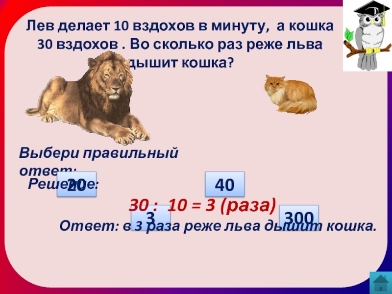 Ответ: в 3 раза реже льва дышит кошка.