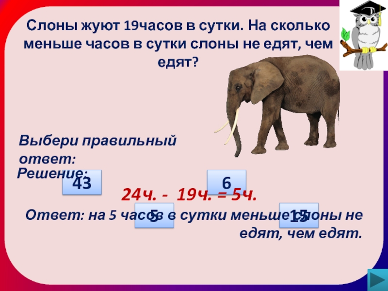 Ответ: на 5 часов в сутки меньше слоны не едят, чем едят.