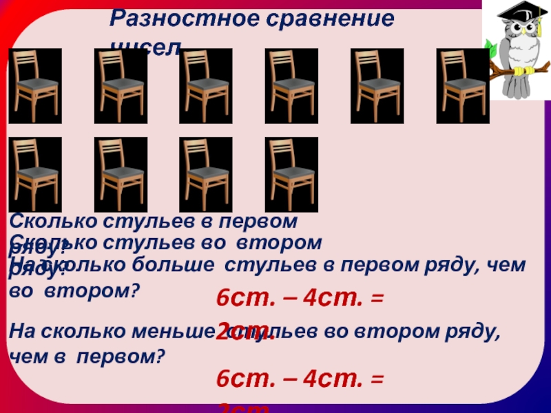 На сколько меньше стульев во втором ряду, чем в первом?