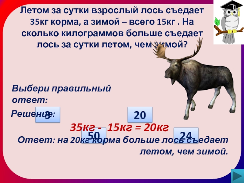 Ответ: на 20кг корма больше лось съедает летом, чем зимой.