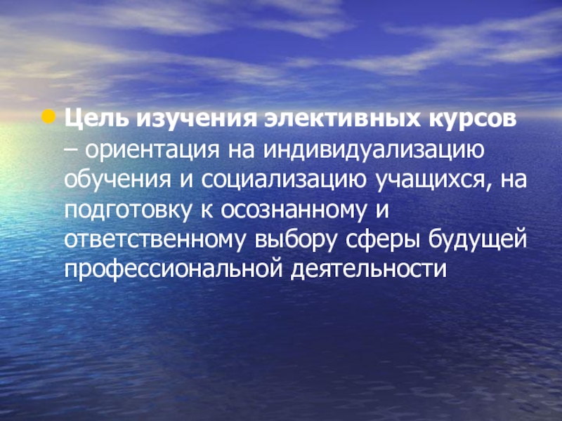 Слайд 4Цель изучения элективных курсов – ориентация на индивидуализацию обучения и социализацию