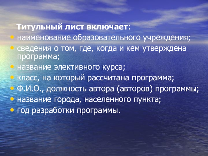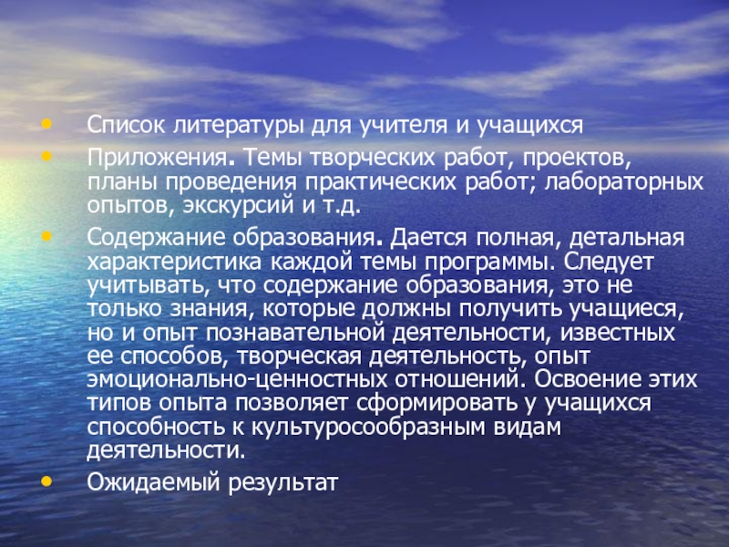Содержание образования. Дается полная, детальная характеристика каждой темы программы. Следует учитывать, что содержание образования, это не только знания, которые должны получить учащиеся, но и опыт познавательной деятельности, известных ее способов, творческая деятельность, опыт эмоционально-ценностных отношений. Освоение этих типов опыта позволяет сформировать у учащихся способность к культуросообразным видам деятельности.
