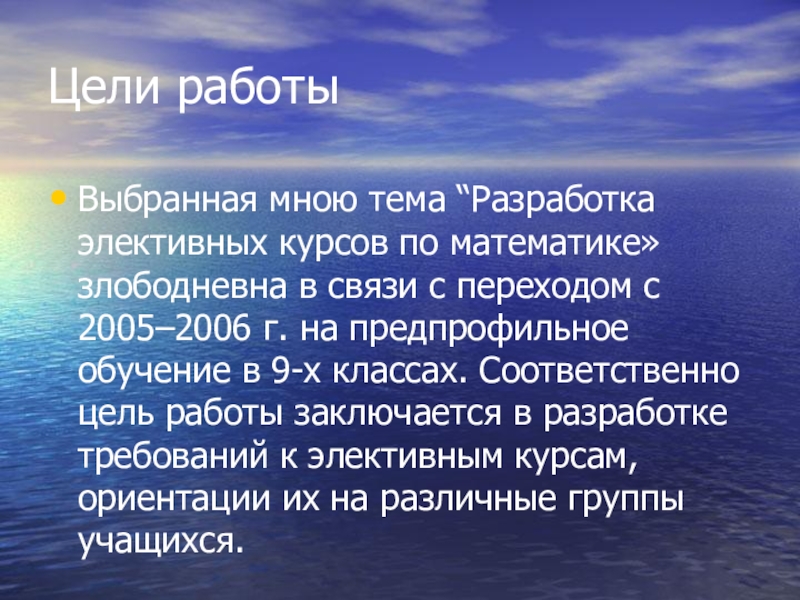 связи с переходом с 2005–2006 г. на предпрофильное обучение в 9-х классах. Соответственно цель работы заключается в разработке требований к элективным курсам, ориентации их на различные группы учащихся.