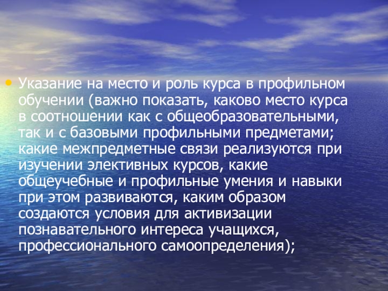 Слайд 10Указание на место и роль курса в профильном обучении (важно показать,