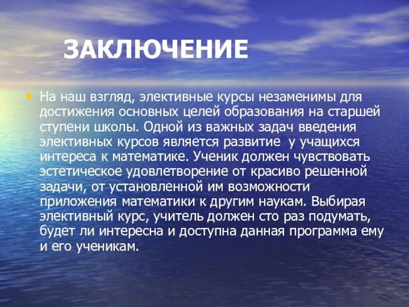 на старшей ступени школы. Одной из важных задач введения элективных курсов является развитие у учащихся интереса к математике. Ученик должен чувствовать эстетическое удовлетворение от красиво решенной задачи, от установленной им возможности приложения математики к другим наукам. Выбирая элективный курс, учитель должен сто раз подумать, будет ли интересна и доступна данная программа ему и его ученикам.