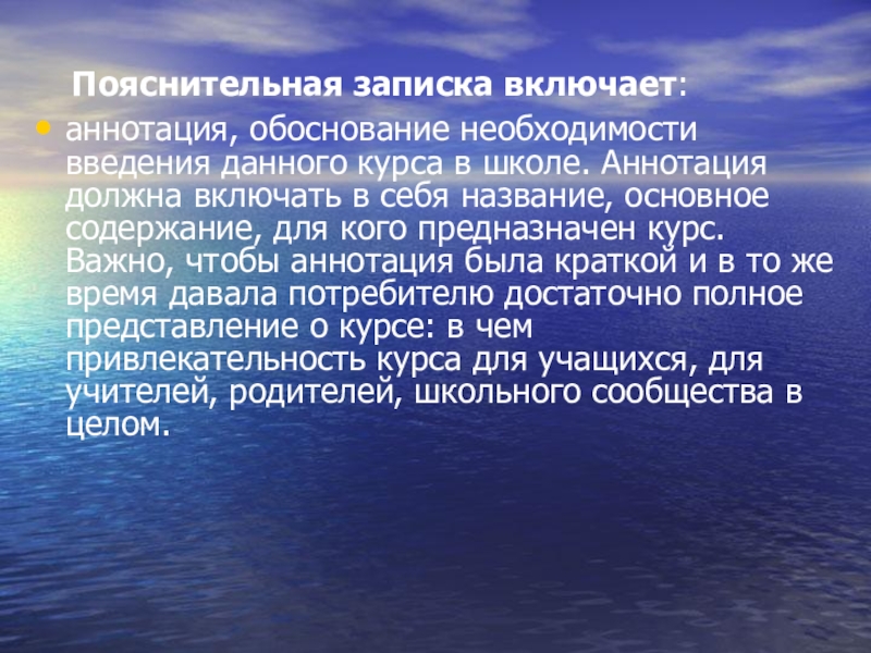 школе. Аннотация должна включать в себя название, основное содержание, для кого предназначен курс. Важно, чтобы аннотация была краткой и в то же время давала потребителю достаточно полное представление о курсе: в чем привлекательность курса для учащихся, для учителей, родителей, школьного сообщества в целом.