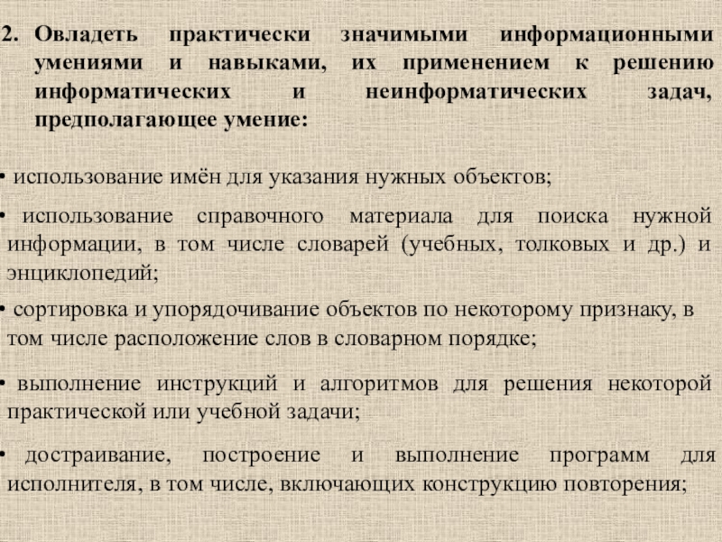 Слайд 15Овладеть практически значимыми информационными умениями и навыками, их применением к решению
