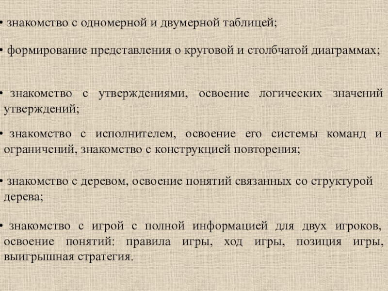 знакомство с игрой с полной информацией для двух игроков, освоение понятий: правила игры, ход игры, позиция игры, выигрышная стратегия.
