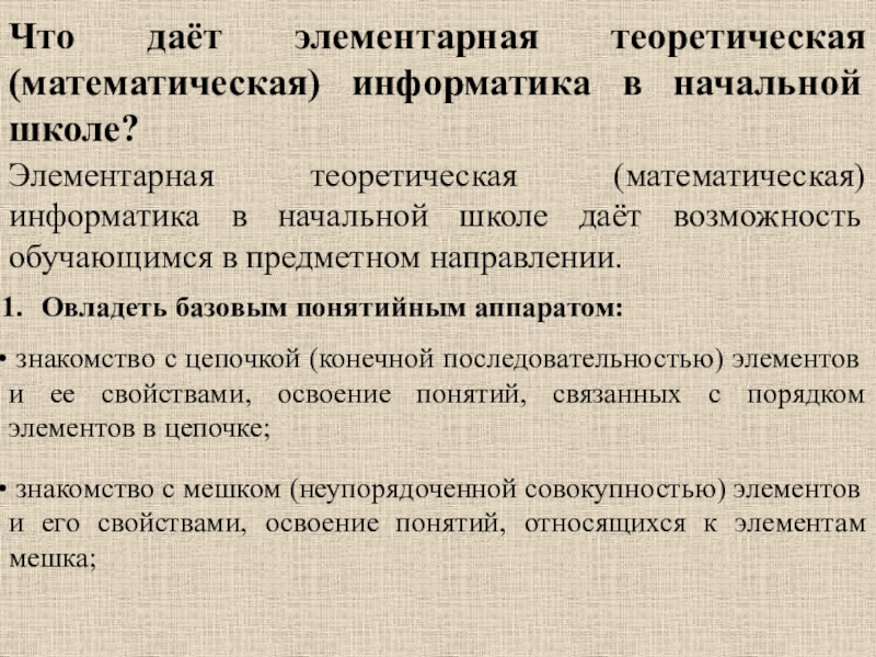 Слайд 13Что даёт элементарная теоретическая (математическая) информатика в начальной школе?