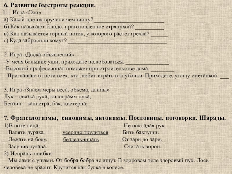 7. Фразеологизмы, синонимы, антонимы. Пословицы, поговорки. Шарады.