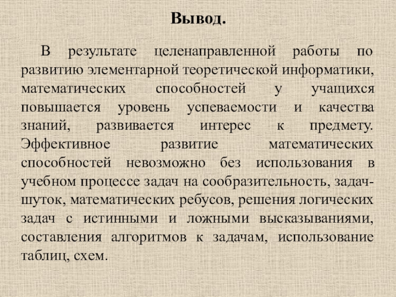 В результате целенаправленной работы по развитию элементарной теоретической информатики, математических способностей