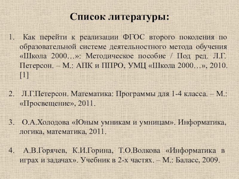 системе деятельностного метода обучения «Школа 2000…»: Методическое пособие / Под ред. Л.Г.Петерсон. – М.: АПК и ППРО, УМЦ «Школа 2000…», 2010. [1]