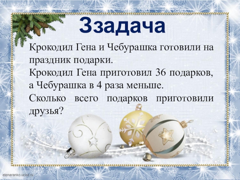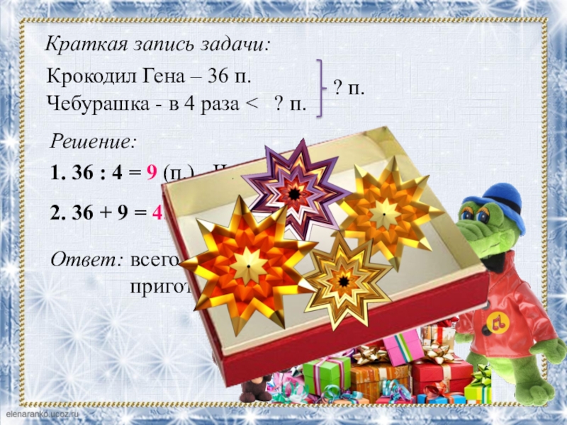 1. 36 : 4 = 9 (п.) - Чебурашка