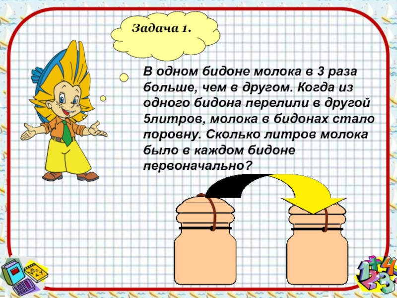 Задача 1.В одном бидоне молока в 3 раза больше, чем в другом. Когда из одного бидона перелили