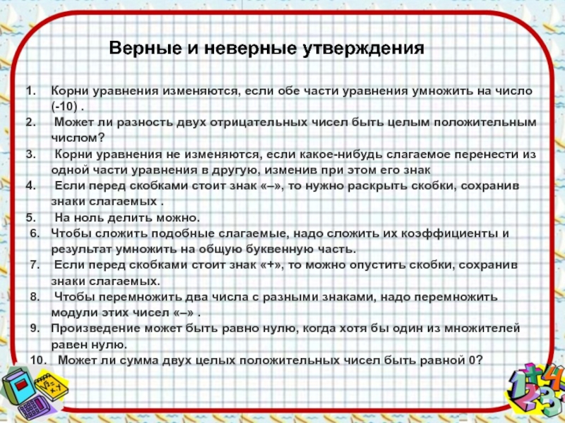 Верные и неверные утвержденияКорни уравнения изменяются, если обе части уравнения умножить на число (-10) . Может ли разность двух отрицательных чисел быть целым положительным числом? Корни уравнения не изменяются, если какое-нибудь слагаемое перенести из одной части