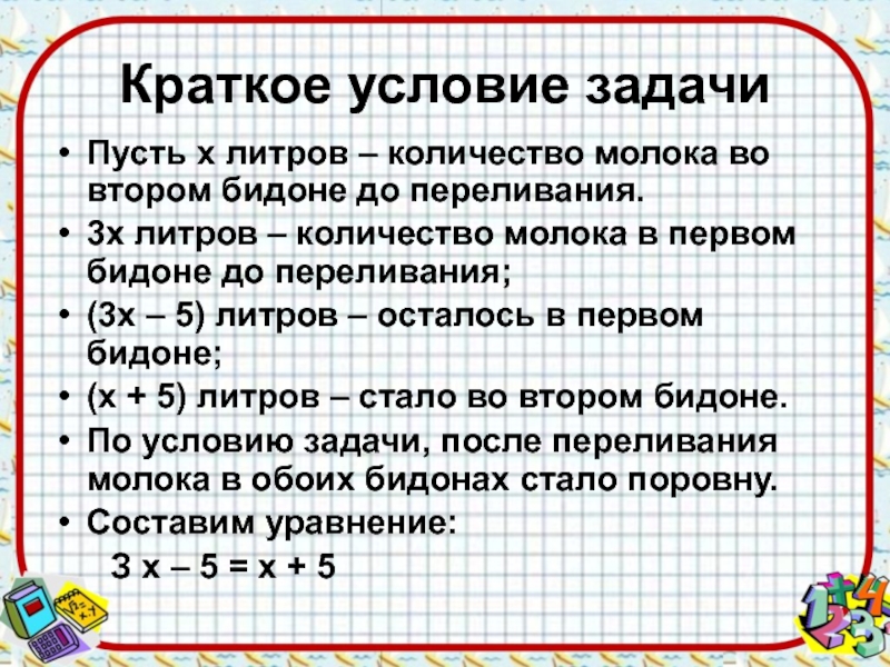 Краткое условие задачиПусть х литров – количество молока во втором бидоне до переливания. 3х литров – количество