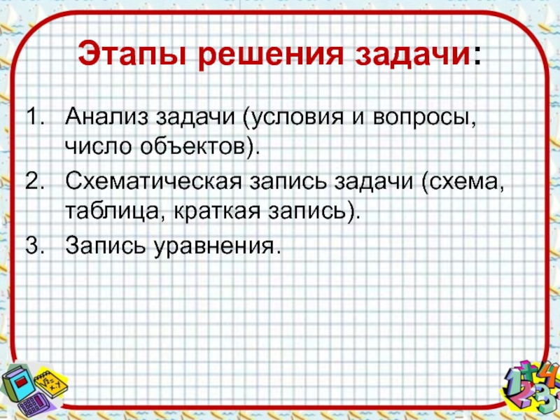 Этапы решения задачи:Анализ задачи (условия и вопросы, число объектов).Схематическая запись задачи (схема, таблица, краткая запись).Запись уравнения.