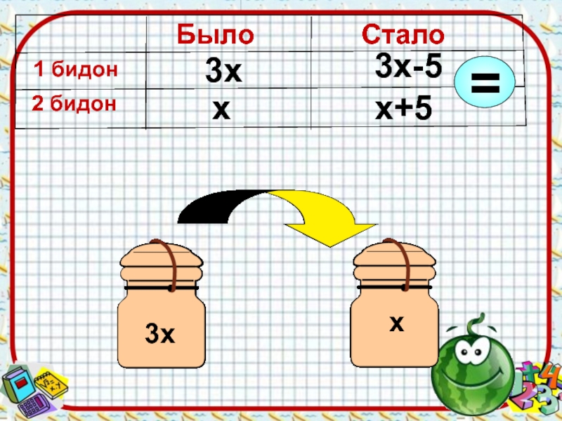 х3х3х-5х+5Было 1 бидон 2 бидонСталоБыло 1 2 Стало3хх