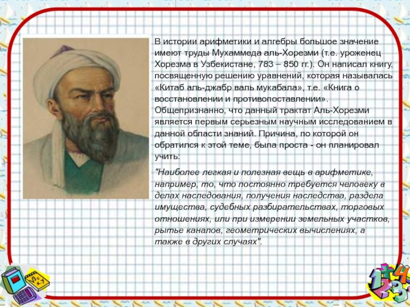 В истории арифметики и алгебры большое значение имеют труды Мухаммеда аль-Хорезми