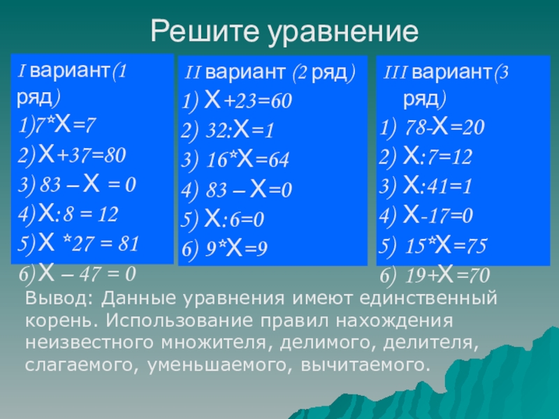 Вывод: Данные уравнения имеют единственный корень. Использование правил нахождения неизвестного множителя, делимого, делителя, слагаемого, уменьшаемого, вычитаемого.