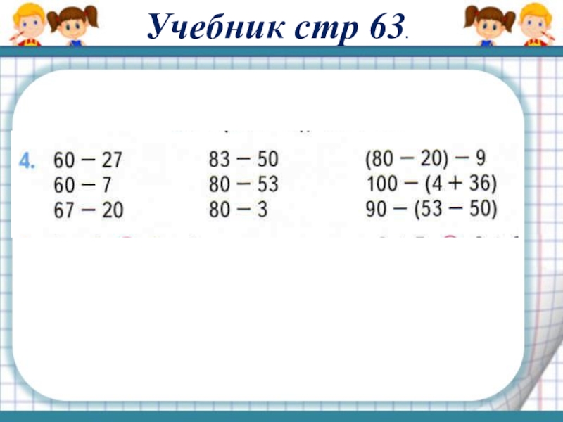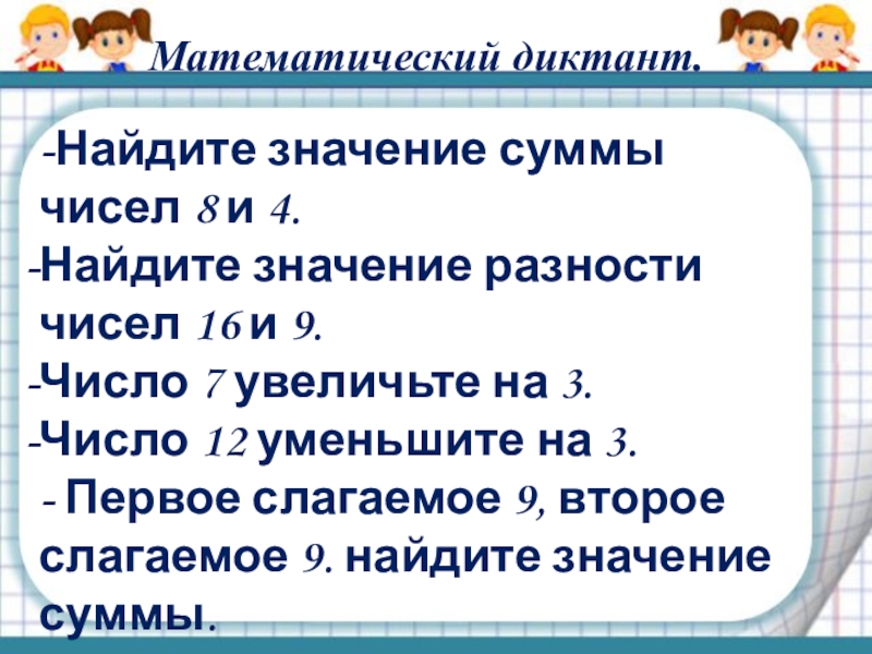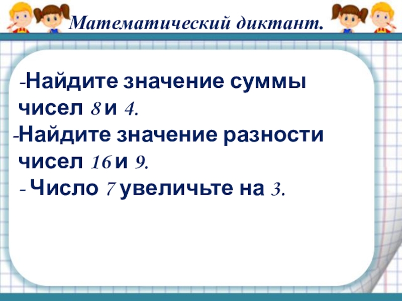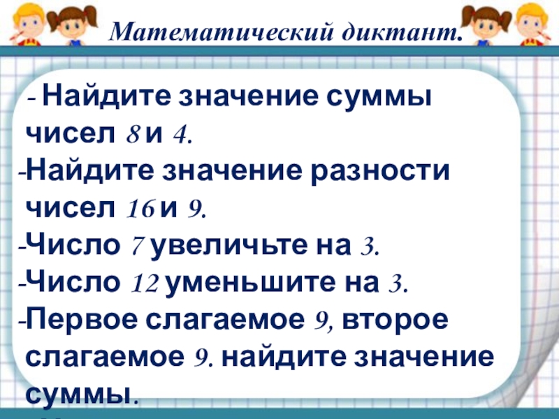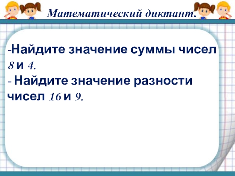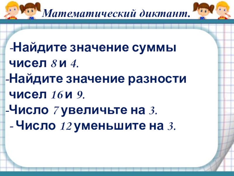 Математический диктант.-Найдите значение суммы чисел 8 и 4.- Найдите значение разности чисел 16 и 9.