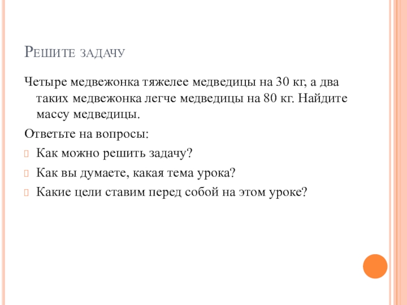 Четыре медвежонка тяжелее медведицы на 30 кг, а два таких