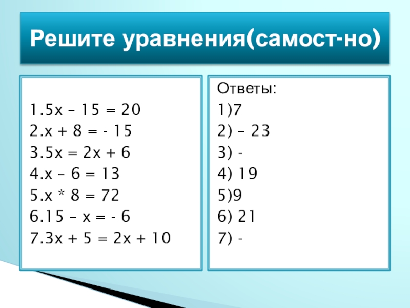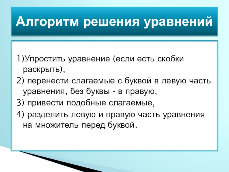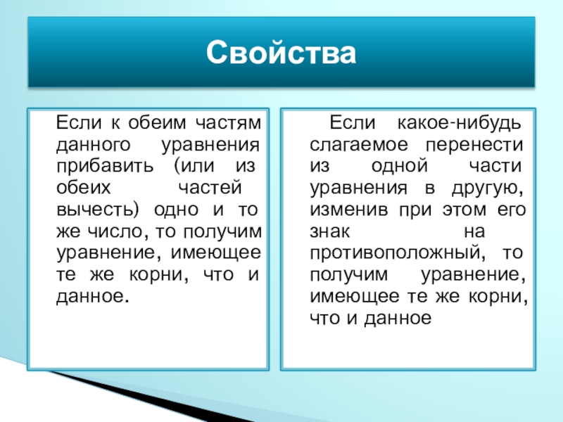 Если какое-нибудь слагаемое перенести из одной части уравнения в другую, изменив при этом его знак на противоположный, то получим уравнение, имеющее те же корни, что и данное
