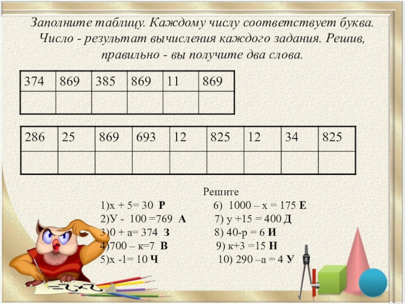 1)х + 5= 30 Р 6) 1000 – х = 175 Е