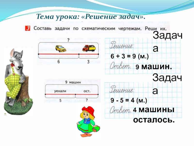 6 + 3 = 9 (м.)9 машин.ЗадачаЗадача9 - 5 = 4 (м.)4 машины осталось.Тема урока: «Решение задач».