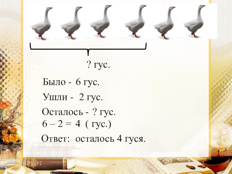 ? гус.Было - 6 гус.Ушли -2 гус.Осталось - ? гус.6 – 2 =4 ( гус.)Ответ:осталось 4 гуся.