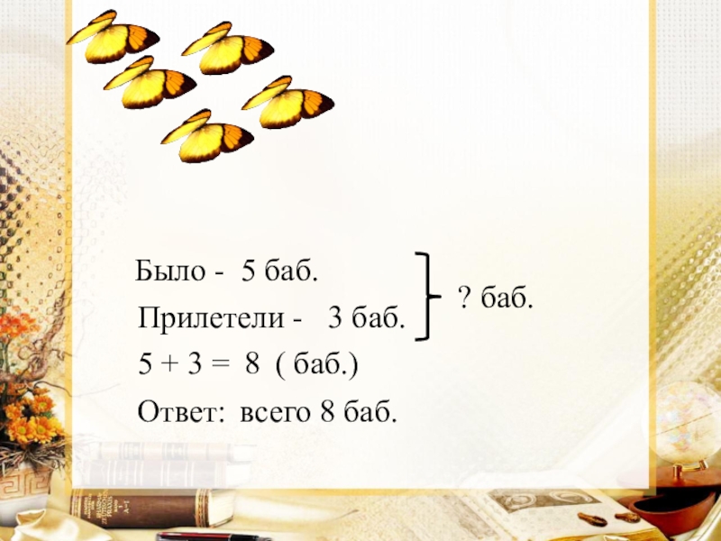 Было -5 баб.Прилетели - 3 баб.? баб.5 + 3 =8( баб.)Ответ:всего 8 баб.